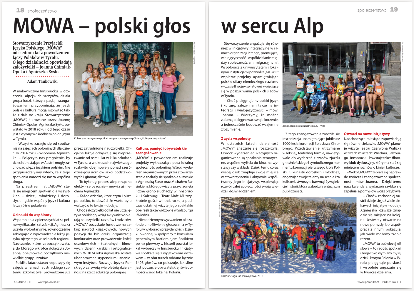 Stowarzyszenie Przyjaciół Języka Polskiego „MOWA” od siedmiu lat z powodzeniem łączy Polaków w Tyrolu. O jego działalności opowiadają założycielki – Joanna Chimiak-Opoka i Agnieszka Sysło.